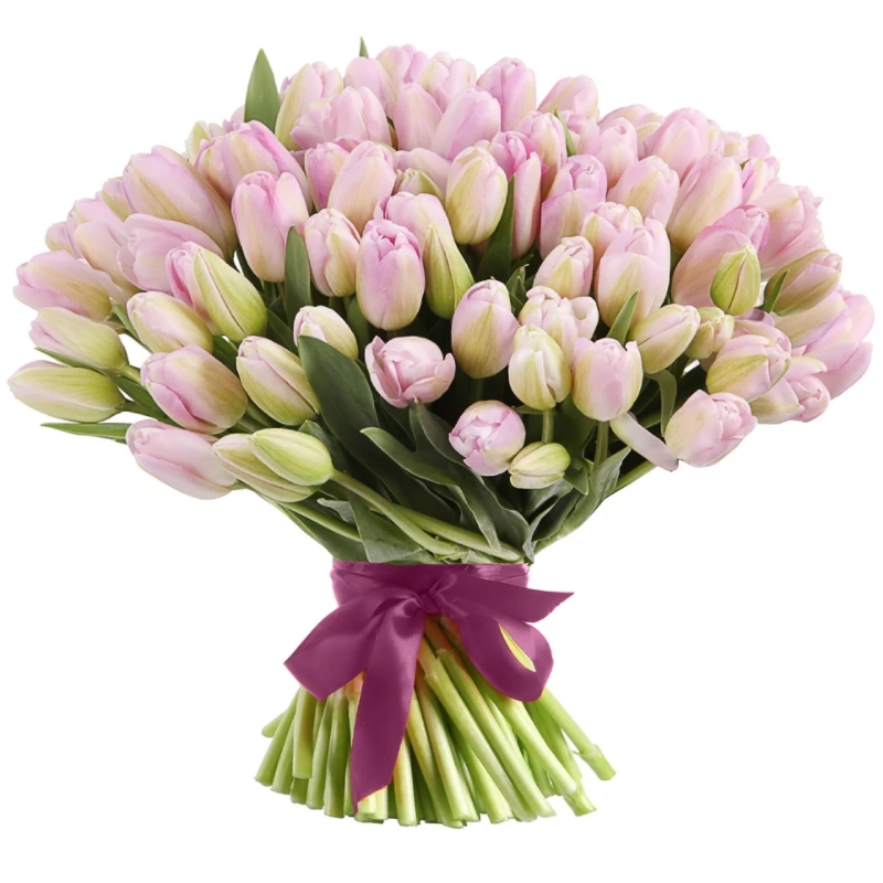 Букет состоит из 101 розовый тюльпан, прозрачная упаковка, атласная лента.