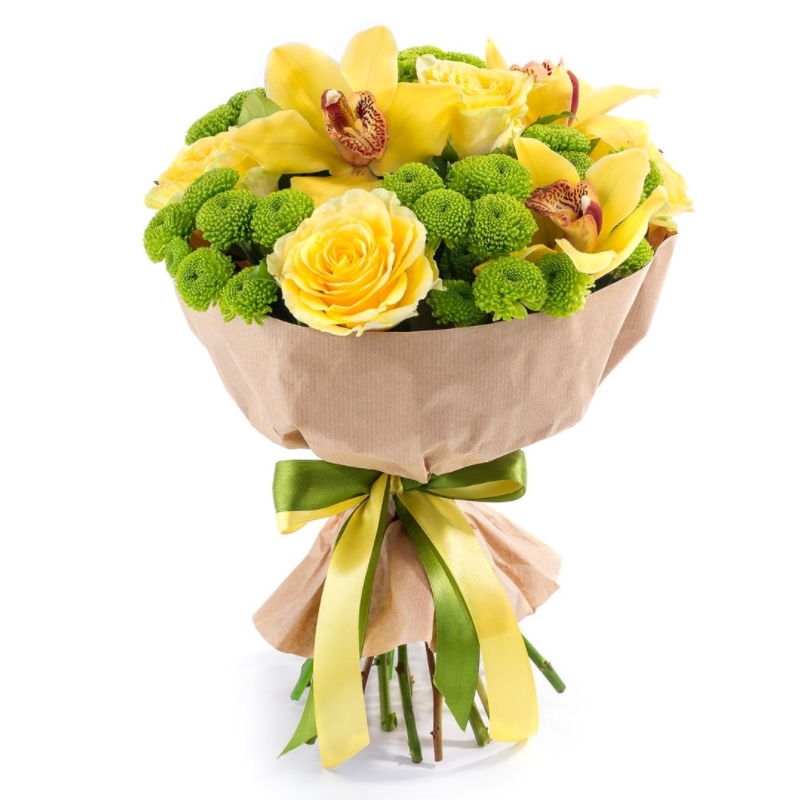 Букет состоит из 4 желтые розы, 3 орхидеи, 6 хризантем Сантини, крафт, атласная лента.
