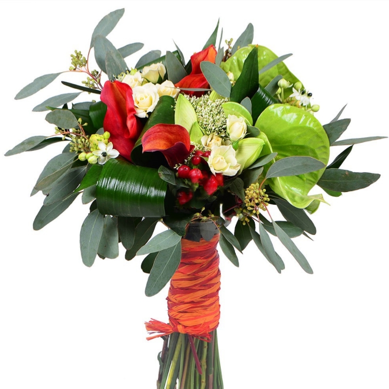 Букет состоит из 3 оранжевые каллы, 2 антуриума, 1 амариллис, 2 ветки гиперикума, 3 ветки кустовой розы, 3 цветка орнитогалума, декоративная зелень, прозрачная упаковка, атласная лента.